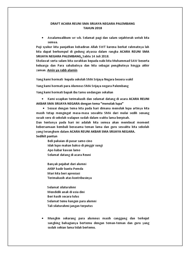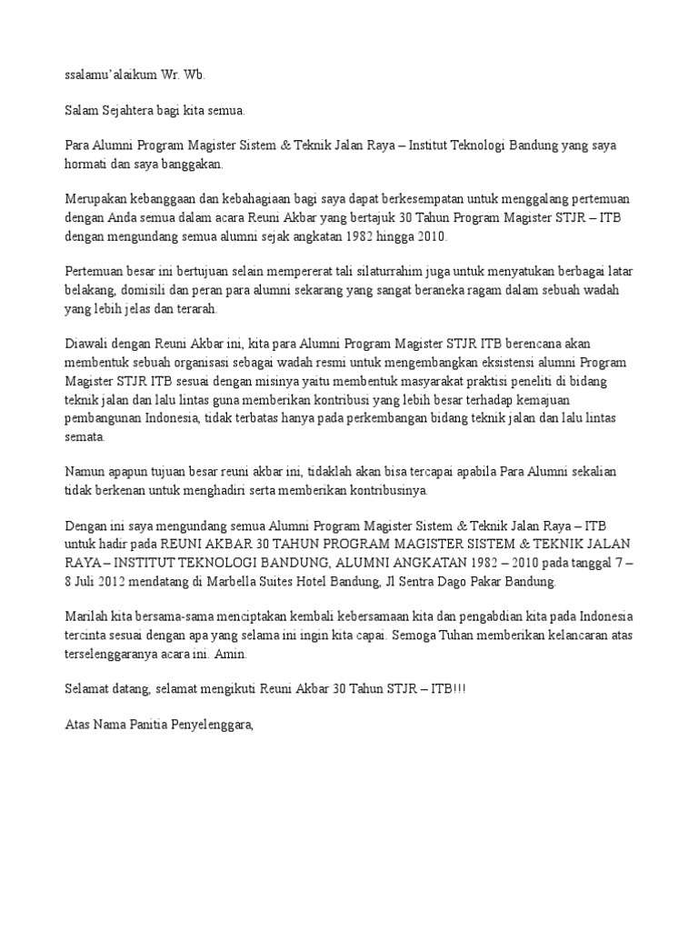 undangan reuni from imgv2-1-f.scribdassets.com Demikian proposal ini kami buat sebagai sebuah acuan contoh penutup proposal reuni. Struktur proposal non formal sama seperti proposal pada umumnya terdapat masalah, saran, pemecahanan, dan contoh proposal non formal yaitu proposal pengajuan reuni sekolah. Download undangan reuni word doc salamun picassa pendidikan. 7 februari 202122 mei 2020 oleh admin. Proposal adalah pengajuan dana untuk sebuah kegiatan yang diadakan disekolah, tempat ibadah, ataupun kegiatan umum di masyarakat. Dalam membuat contoh proposal kegiatan sekolah anda harus menjelaskan secara lengkap proposal merupakan serangkaian kegiatan yang di dalamnya berisi tentang rancangan kerja. Proposal penelitian disusun secara sistematis dan bersifat ilmiah, sehingga sudah sebaiknya proposal yang diajukan menggunakan kalimat yang sesuai dengan tujuan proposal yang dibuat. Peserta reuni akbar sma negeri antara lain a.